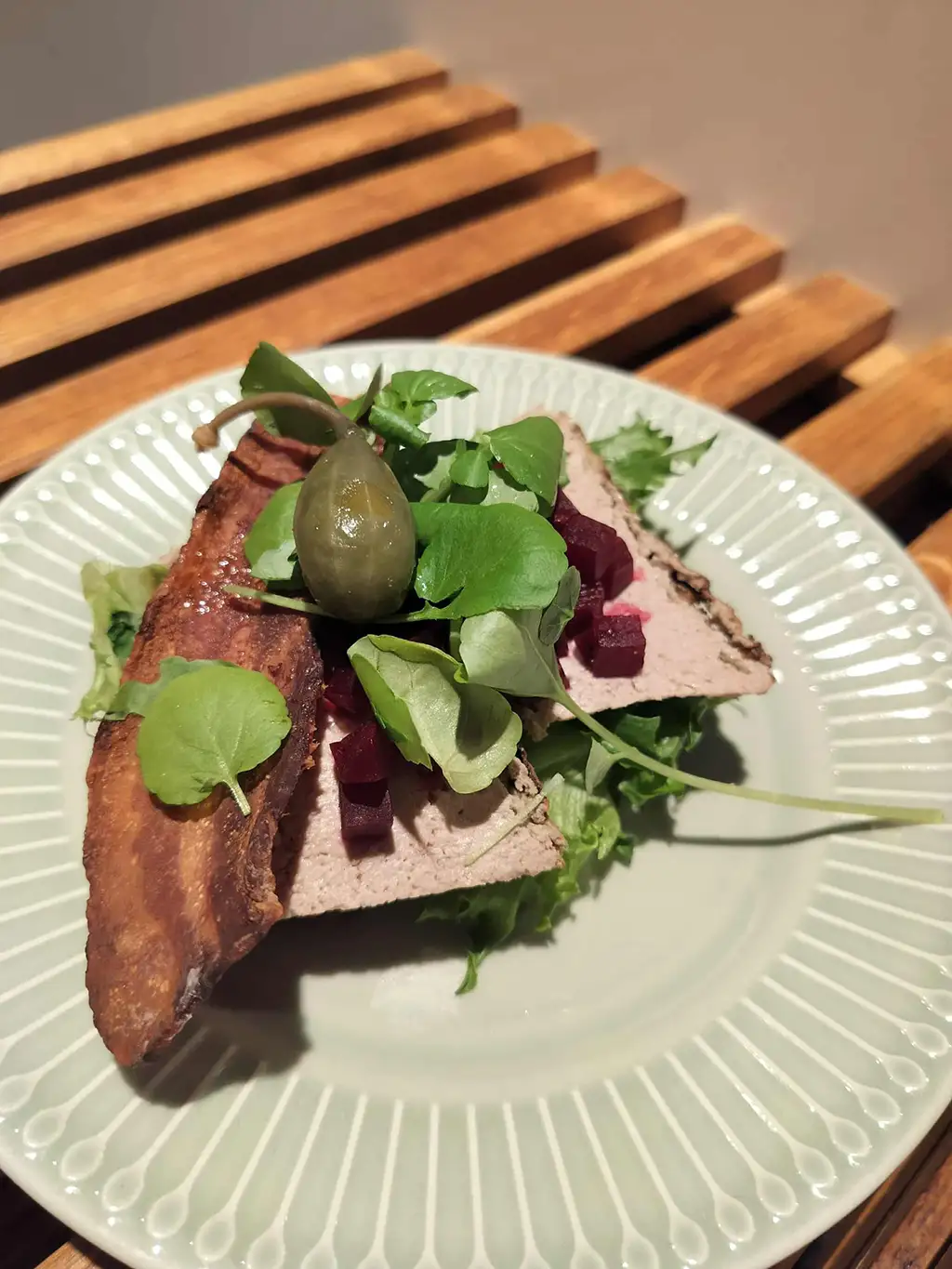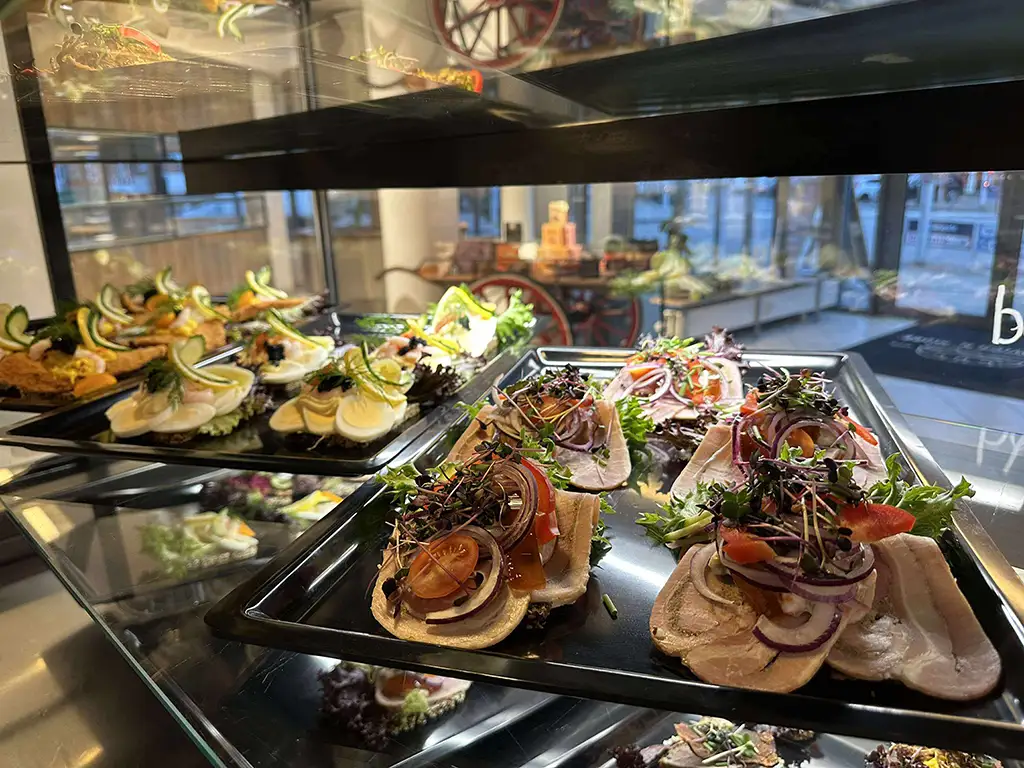 Vores smørrebrød bliver anrettet på friskbagt, mørkt rugbrød og toppet generøst, så både klassiske favoritter og grønnere alternativer får plads. Om du er til sprød rødspætte med remoulade eller klassisk roastbeef med peberrod, har vi noget, der rammer din smag – og som både ser godt ud på fadet og mætter ordentligt.