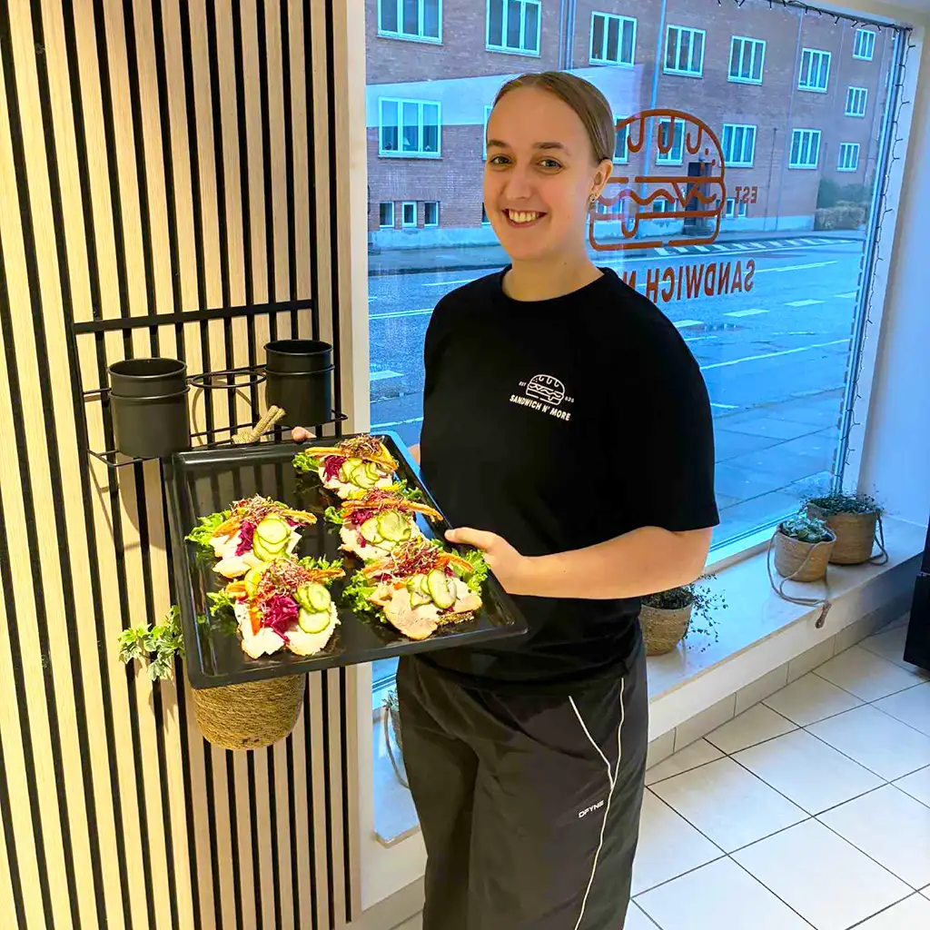 Vores smørrebrød er bygget op om gode råvarer, friskbagt rugbrød og solide klassikere med et moderne twist. Alt smøres i hånden i køkkenet i Vejle, så du får mad, der både ser indbydende ud og smager af noget – uanset om det er til frokost, møde eller selskab.